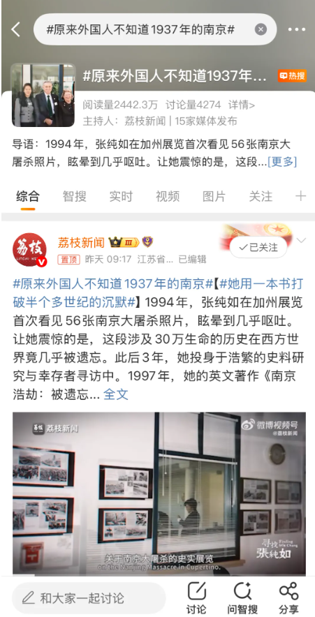 當晚,江蘇衛視還連續播出國家廣播電視總局2024—2025年“網絡視聽節目精品創作傳播工程”重點紀錄片《尋找張純如》上下集,通過長期深耕南京大屠殺題材紀錄片導演的視角,以美籍華裔女作家張純如的人生經歷為主線,聚焦她深入調查南京大屠殺這一黑暗歷史、向世界揭示南京大屠殺暴行真相的艱辛歷程,展現張純如強烈的正義感和使命感,彰顯捍衛歷史真相的堅定信念與跨越國界的和平祈愿。總臺對該片進行全矩陣推發,系列話題總傳播量破1億,其中“請記住她的名字張純如”“紀錄片尋找張純如”“原來外國人不知道1937年的南京”等登上微博全國熱搜,引起強烈共鳴。