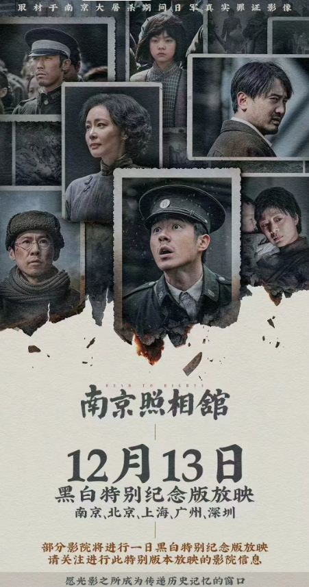 同日,由幸福藍海出品并參與制作的電影《南京照相館》黑白特別紀念版也在南京、北京、上海、廣州、深圳五城啟動一日限定放映。幸福藍海國際影城旗下8家南京直營店參與其中,并組織了包括南京大屠殺幸存者后代、歷史研究學者、中學生代表以及普通市民在內的多方群體共同觀影?,F場觀眾表示:“黑白影像剝離了色彩的修飾,讓歷史真相以最本真的面貌呈現,這是一種具有儀式感的銘記方式,讓人更直觀地感受到歷史的重量,也愈發珍視當下的和平。”